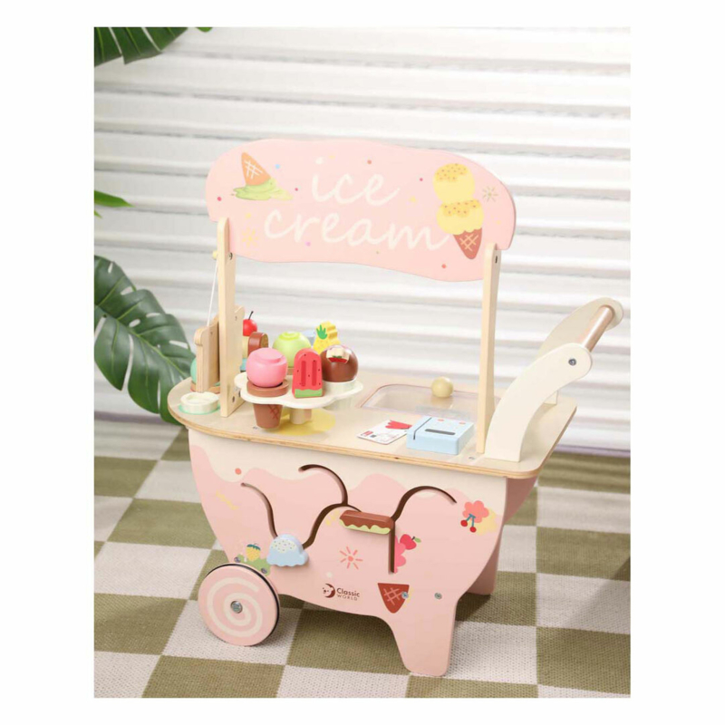 Met deze Classic World ijswagen kunnen kinderen zelf ijsjes gaan verkopen. Deze houten kar rijdt echt, dus ze kunnen overal hun eigen ijswinkel openen. Op de toonbank is plek voor alle verschillende…€ 63,95